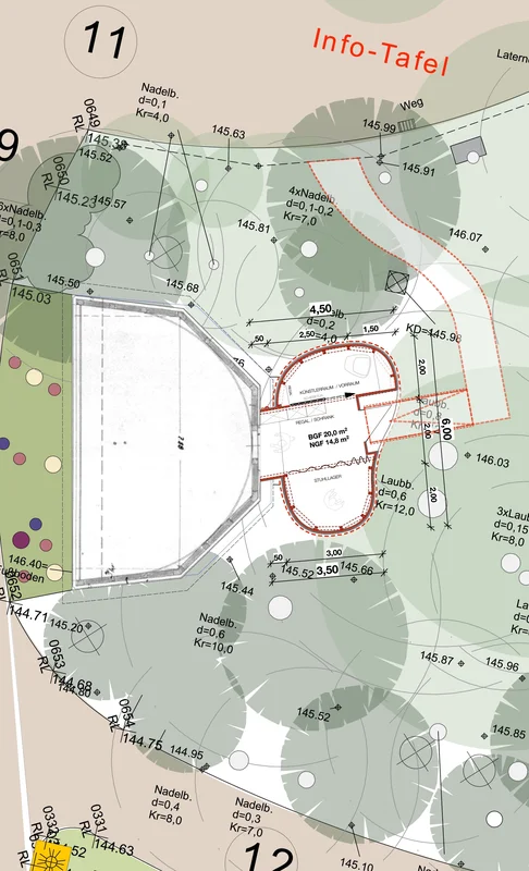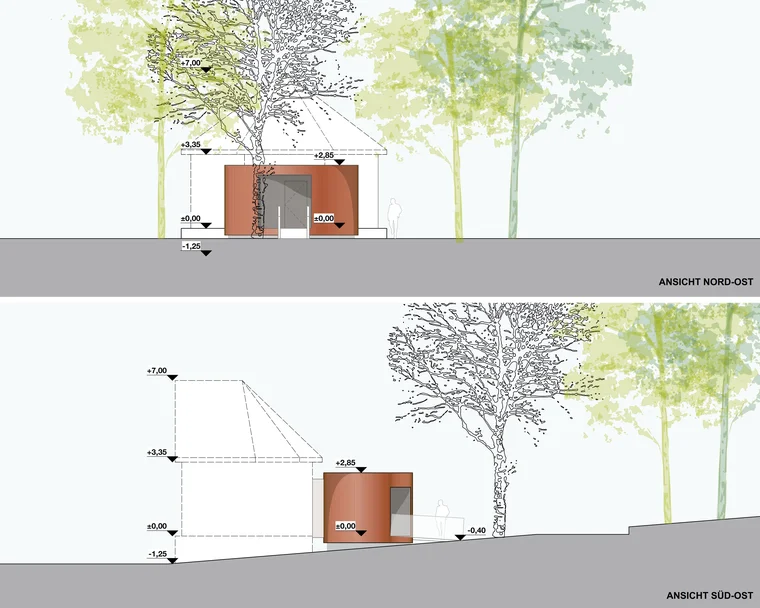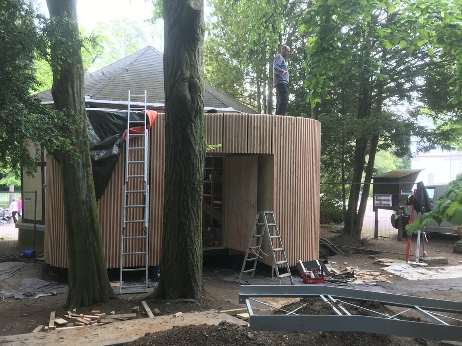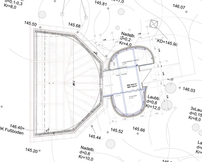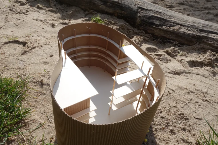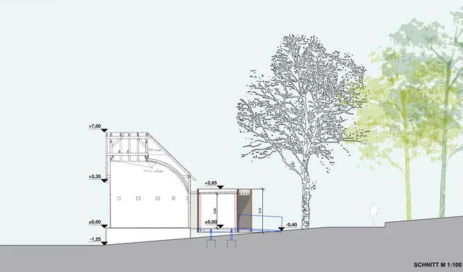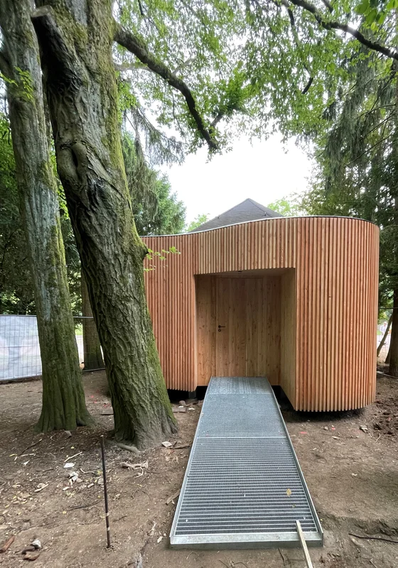 Der Anbau soll sich einerseits formal von der Konzertmuschel differenzieren und muss sich andererseits in die denkmalgeschützte Gesamtanlage einfügen. Die aus diesen Anforderungen abgeleitete Idee einer amorphen Grundrissform und einer an „Wald“ erinnernden Fassade leitet sich aus seiner Lage inmitten einer mit Büschen und Bäumen bewachsenen Fläche ab.
