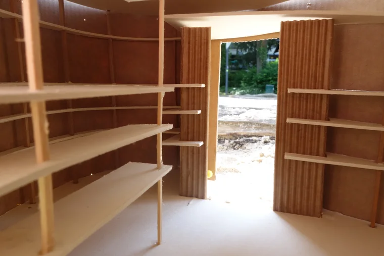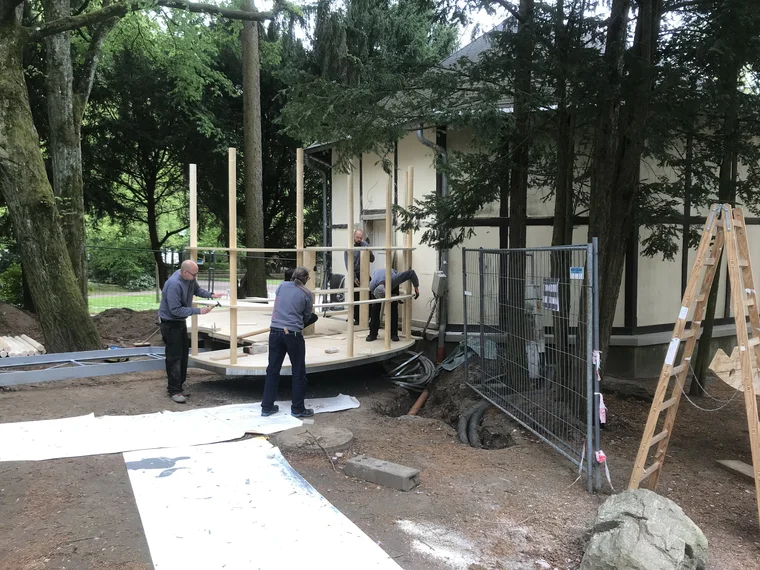 Der Anbau dient als Umkleideraum für auftretende Musiker und als Lager für Bühnenbedarf (Stühle, Instrumente e.a.).