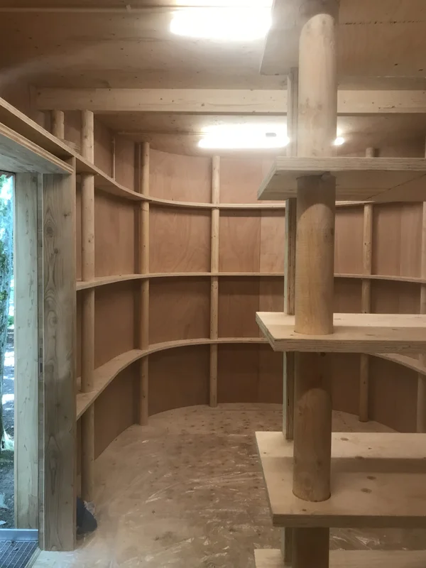 Die Baukonstruktion ist wie ein Baukasten entwickelt; das ermöglichte Vorfertigung und eine kurze Bauzeit. Die Fassade besteht aus vorgesetzten, vertikalen und sägerauen Latten aus heimischer Lärche.