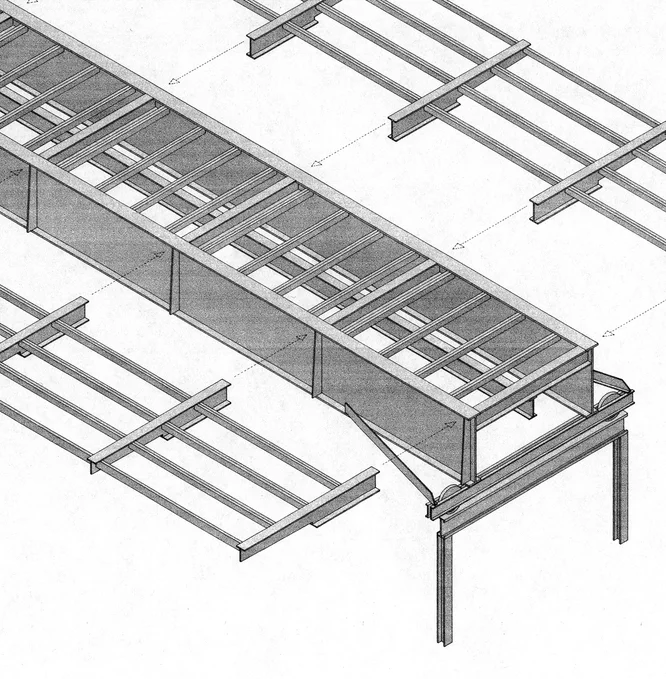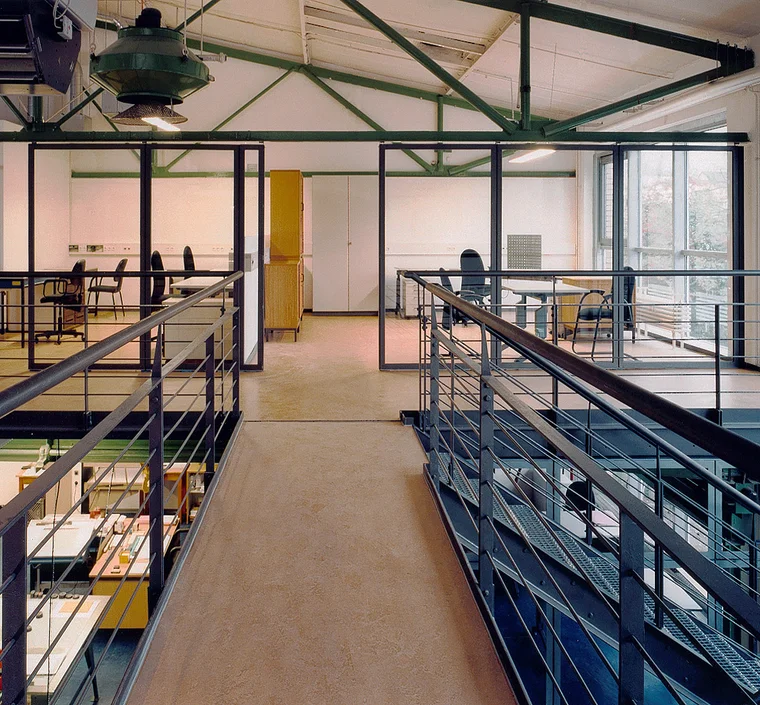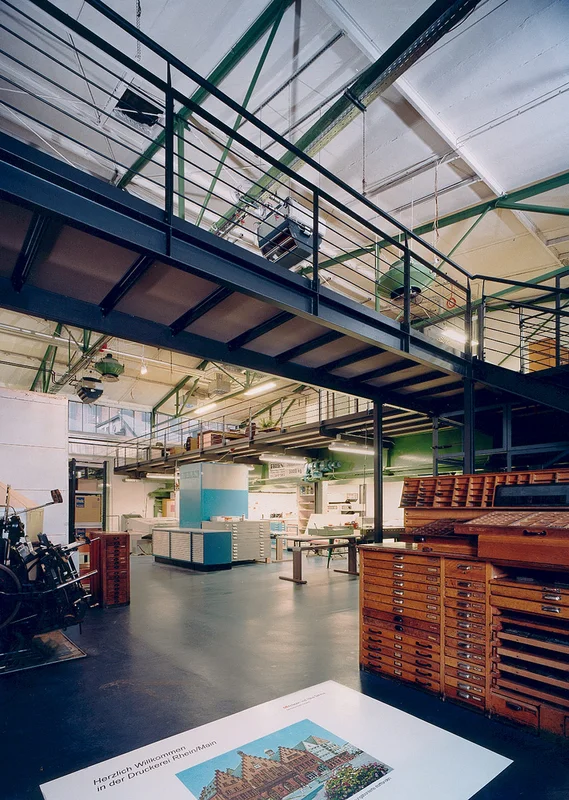 Die Druckerei besteht aus dem Drucksaal, der Druckvorstufe sowie verschiedenen Sonderräumen. Der Drucksaal ist als Haus-in-Haus-Konstruktion geplant, wodurch ein Schalldämm-Maß von 65 dB erreicht werden konnte. Die vorhandene Kranbahn eines Schwerlastkrans wurde als Unterkonstruktion für eine neue Zwischenebene genutzt. Die Außenwand wurde großflächig für Fenster geöffnet.