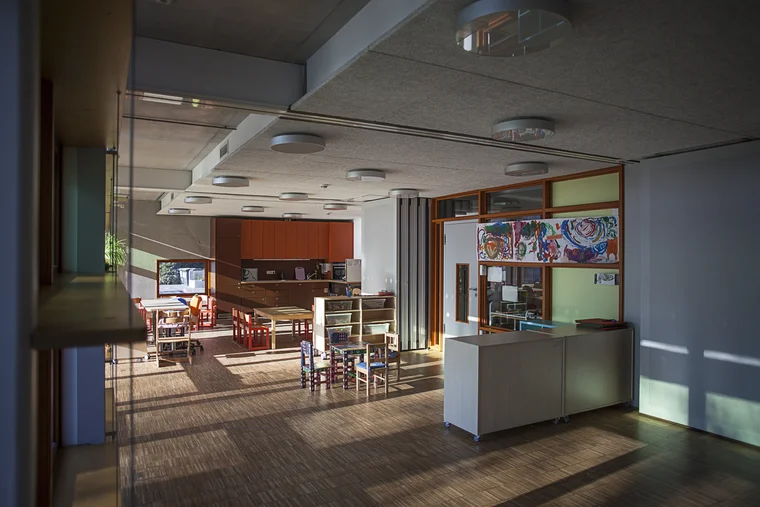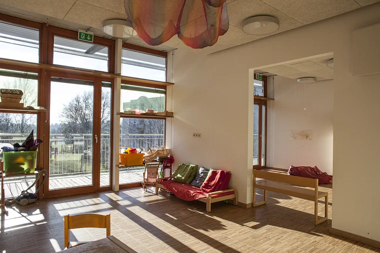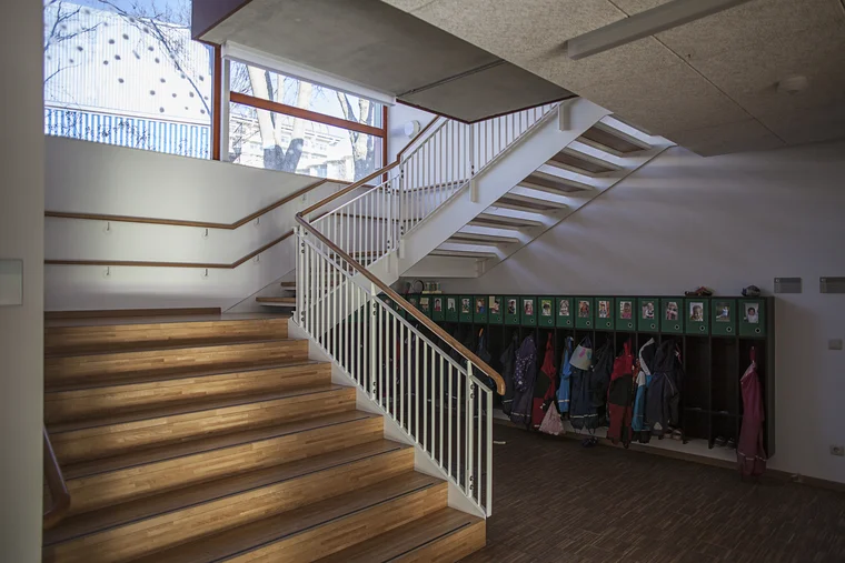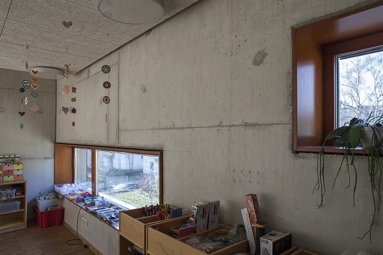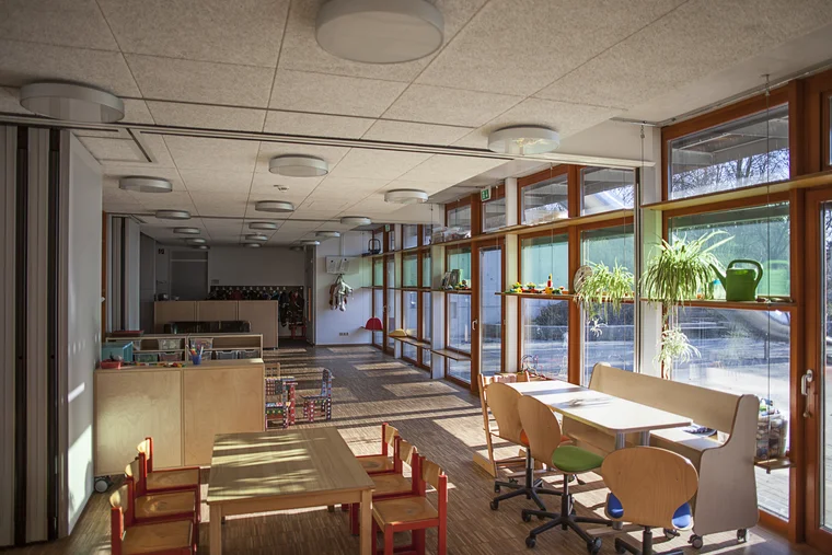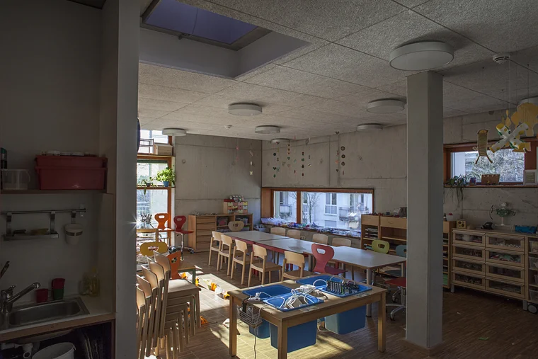 Das pädagogische Konzept, das durch Offenheit der Nutzung und Selbstbestimmung der Kinder geprägt ist, findet seine Entsprechung in der differenzierten Raumstruktur entlang des großzügigen Bewegungs- und Verbindungsraumes „Flur“ mit zahlreichen eigenen Aufenthalts- und Spielmöglichkeiten, zum Beispiel die auch als kleines Theater nutzbare überbreite Treppe. Durch das lineare Konzept sind auch die Räume im Obergeschoss einfach in Größe, Funktion, Zuordnung und Lage austauschbar und ermöglichen Anpassungen an neue Konzepte oder Notwendigkeiten.