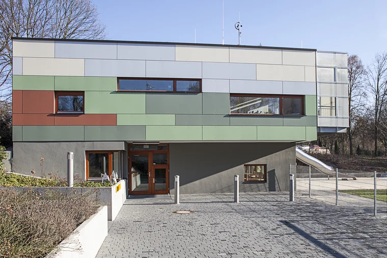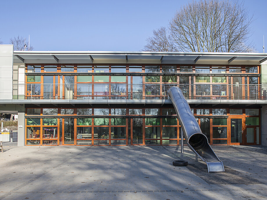 Der Neubau der Kindertagesstätte auf dem Gelände der berufsgenossenschaftlichen Unfallklinik Frankfurt nutzt die leichte Hanglage, um in Erd- und Obergeschoss eines zweigeschossigen Baues mehrere direkte und ebenerdige Ausgänge ins Freie zu ermöglichen. Hierdurch konnte auf jedwede einschränkende, dazu teure, brandschutztechnische Auflagen in Fluren und Treppenräumen verzichtet werden. Der Neubau wurde als Passivhaus geplant.
