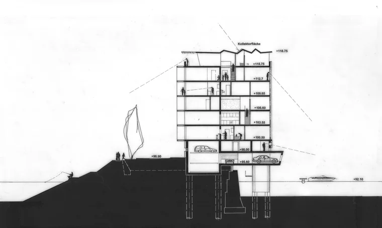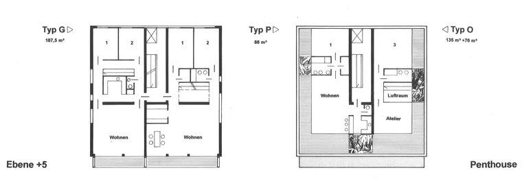 Die innere Erschließung der Häuser ist darauf angelegt, ihren Anteil an Außenwandflächen gegenüber der Entwurfsvorgabe zu reduzieren; hierdurch bleibt ein hohes Maß an gut belichteten Flächen für die Eigentumswohnungen frei. Gleichzeitig nutzt die Erschließung die inneren, vergleichsweise schwach belichteten Kernflächen.