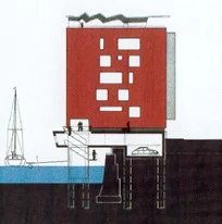 Ein allgemein zugänglicher Steg hafenseitig unmittelbar entlang der Mole verbindet alle Doppelhäuser miteinander. Er ist erreichbar über Abgänge aus den Zonen zwischen den Doppelhäusern.