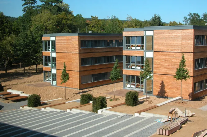 Gegenstand der Planung war eine Schule mit Klassenräumen unterschiedlicher Größe, mit Fachklassen, Mehrzweckhalle, Küche, Mensa, Verwaltung und entsprechenden Technikräumen; im denkmalgeschützten Schloss sollten Bibliothek und Freizeiträume entstehen. 24 Wohnungen für je acht Schülerinnen bzw. Schüler, acht Wohnungen für Sozialpädagogen sowie eine Hausmeisterwohnung sollten als Wohndorf geplant werden. Auf den Maßstab der vorhandenen Nachbarbebauung musste angemessen reagiert werden, die Ausweisung des unteren Grundstückteils als Landschaftsschutzgebiet war zu berücksichtigen. An die zentrale Erschließung der Schule fügen sich im Erdgeschoss Verwaltung, die eingeschobene Mehrzweckhalle und die Mensa; das 1. Obergeschoss beinhaltet die Fachklassen, während die Klassenräume im 2. Obergeschoss eingerichtet sind.